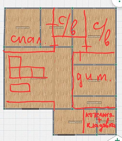Моя думка, що по перше я б об´єднала зону однієї спальні з кухнею. Якщо Ви час проводите більше в кухні, то об´єднана зона кухні з вітальнею 20-22 кв.м буде комфортно, а на місті вітальні зробити дитячу і якось відділити прохідну зону. Кладову треба збільшити. Взагалі не треба робити вузькі приміщення. Більш толкові в плануванні приміщення, наближені до квадрату. Санвузол я би переділила на 2, щоб мати змогу 2 унітази поставити. І Вам дуже слушно пишуть про душову. Можливо буде собака, то її помити зразу в душовій можна. Це ж будинок)). Вхід в туалет з вітальні зовсім не годиться.