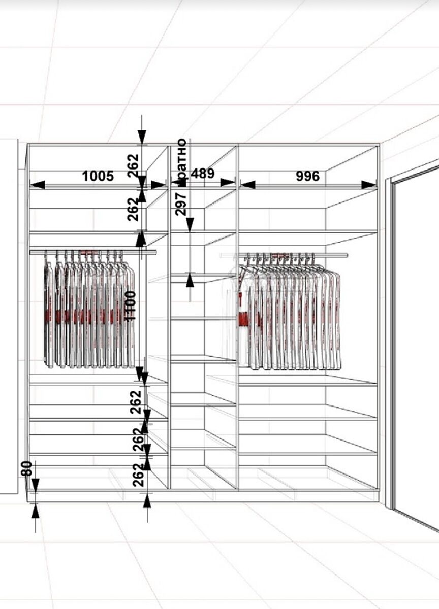 Здравствуйте, планирую шкаф в спальню. Мастер сделал такой проект. Хочу внизу не полку , а чтоб были ящики. И может лучше для вешалок сделать два ряда( друг над другом) , а полки будут только в среднем отделе и в самом верху?