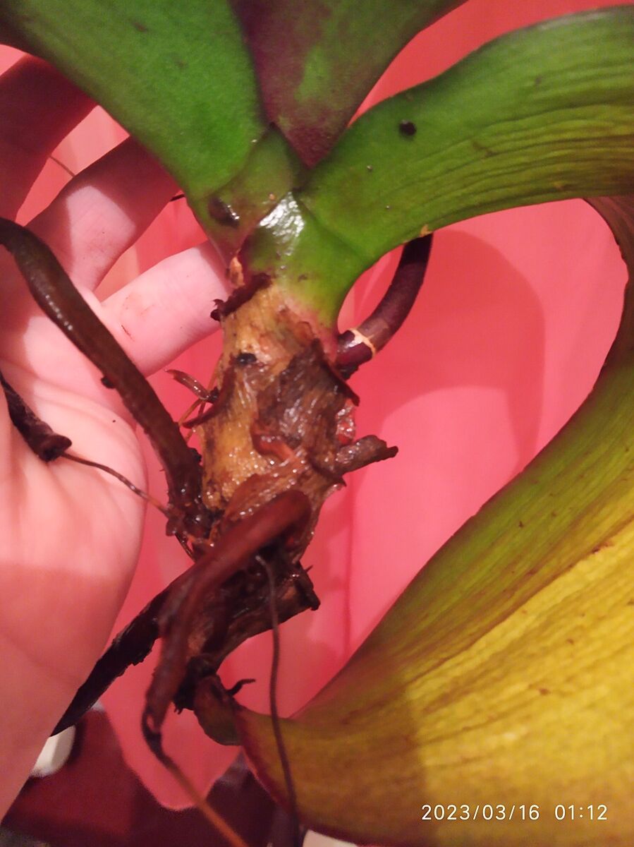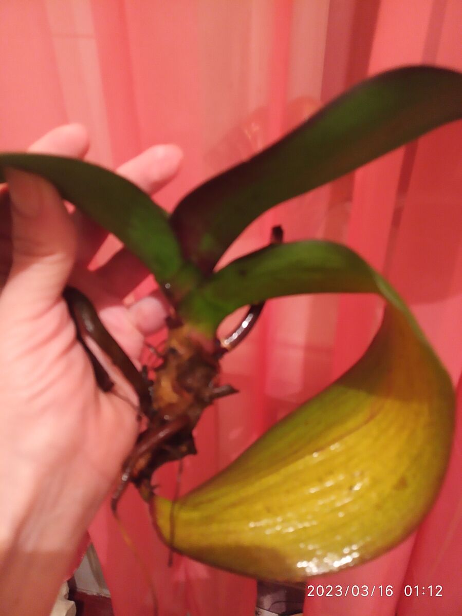 Это вам не здесь надо спрашивать, а в спец.группах на фб. То, что я вижу-пень сгнил-весь желтый. Обрежьте гнилое до живого, ставьте орху над водой (или листьями в воду, все по разному делают) и ждите новых корней. Желтый лист снимите. Марганцовка не вариант.