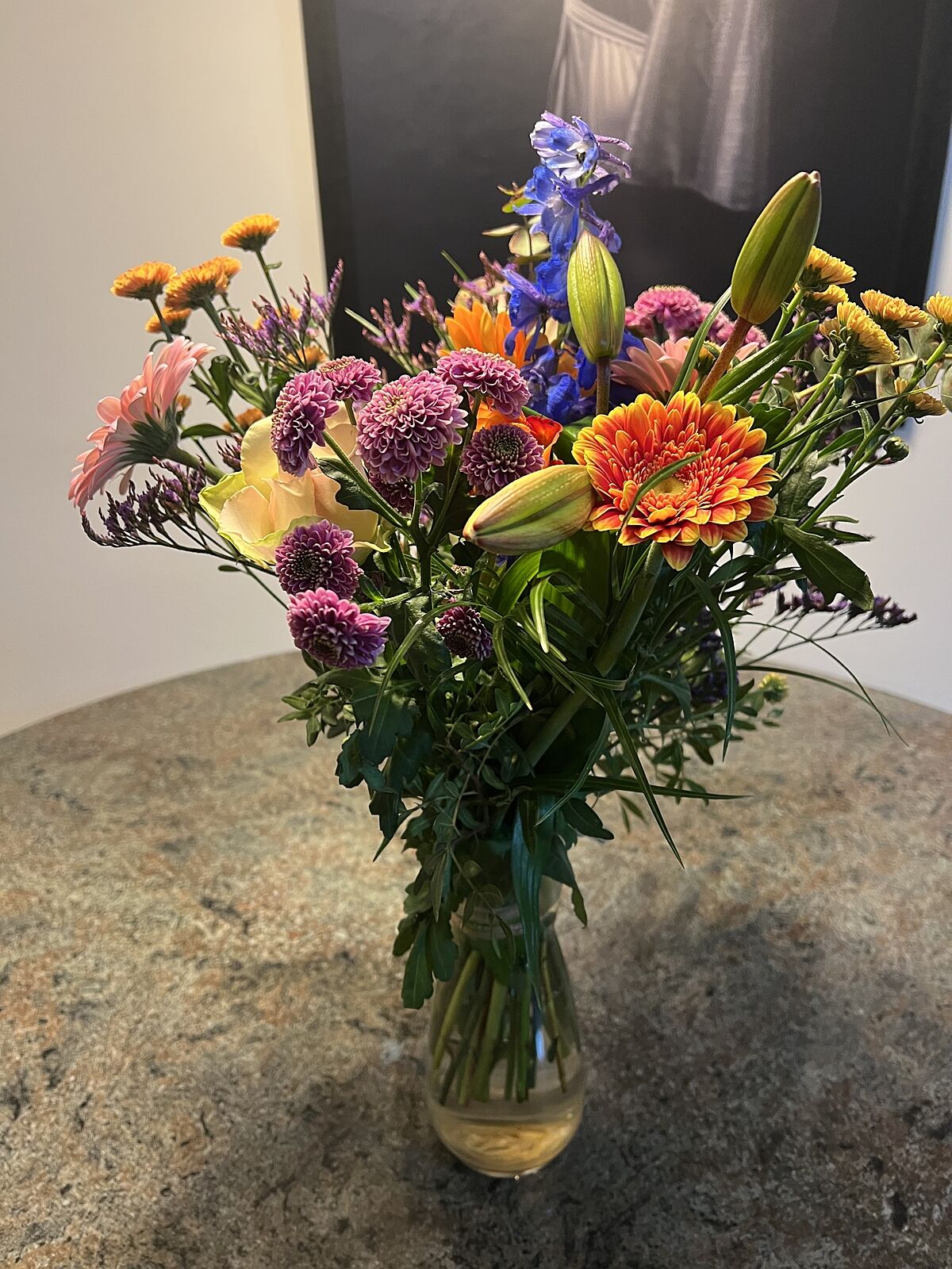 Вчора вже прибрала букет. А ті, що чоловік подарував в горщику, квітнуть і нікуди не збираються))