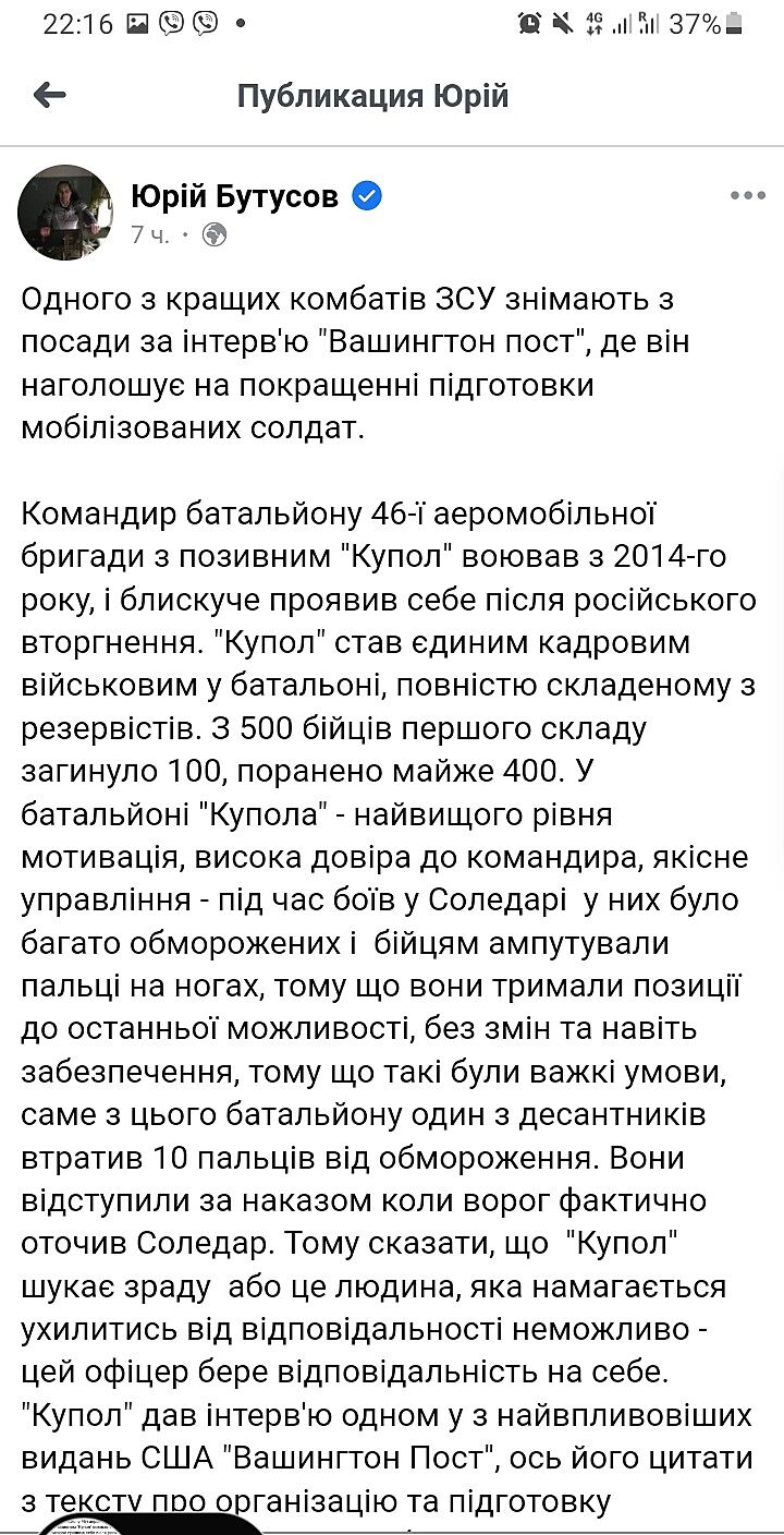 А от коли хлопці, зовсім без досвіду, в Бахмуті, в самій гарячій точці планети залишають позиції, бо не знають як їм стріляти. Бо не вчились Про це писати не можна - це зрада.