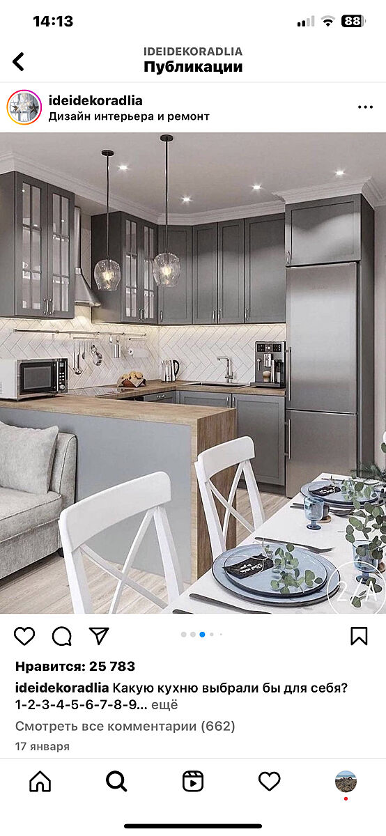 А яка площа кухні? Ваші варіанти наштовхують на думку, що це невелика кухня- студія або кухня в смарті. В мене задача зробити кухню-студію і я не хочу обмежуватись робочою зоною. Хочеться щось цікавого. Суто з практичного підходу, то не хочу робити верхні шафи вище 2м від підлоги. Все що вище-викинуті гроші, лазиш до них в кращому випадку раз на рік. Тому хочеться відійти від всезагальної фундаментальності