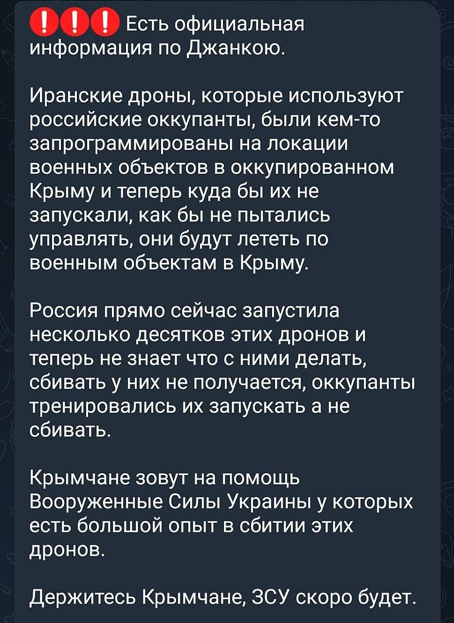 Есть официальная информация по Джанкою. Иранские дроны которые используют российские оккупанты были кем-то запрограммированы на локации военных объектов в оккупированном Крыму и теперь куда бы их не запускали, как бы не пытались управлять, они будут лететь по военным объектам в Крыму. Россия прямо сейчас запустила несколько десятков этих дронов и теперь не знает что с ними делать, сбивать у них не получается, оккупанты тренировались их запускать а не сбивать. Крымчане зовут на помощь Вооруженные Силы Украины у которых есть большой опыт в сбитии этих дронов. Держитесь Крымчане, ЗСУ скоро будет.