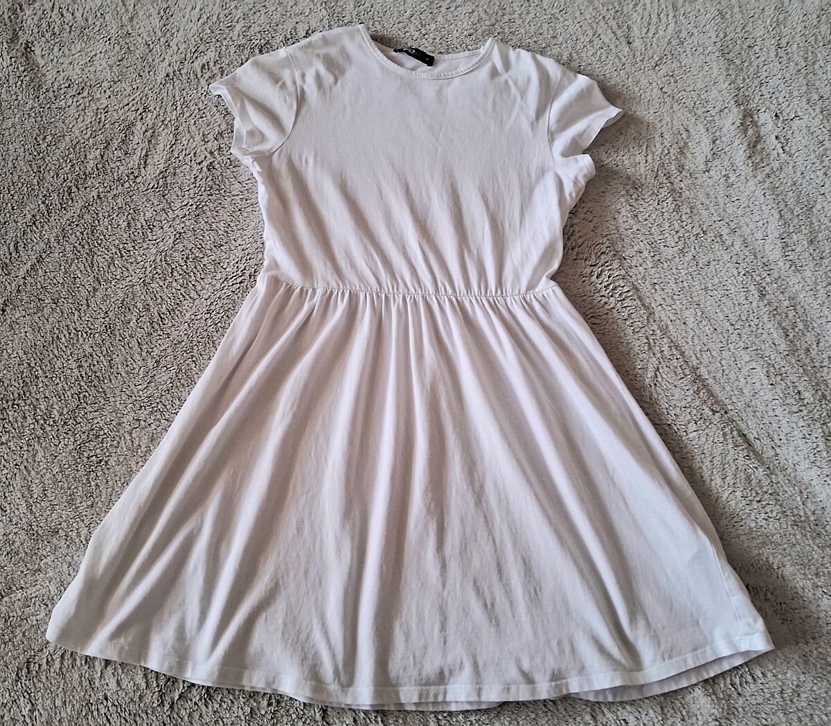 Віддам трикотажну сукню, на худеньку дівчинку, колір чисто білий, гарний стан, вказаний розмір М, але маломірить, ширина в грудях 42см, довжина 80см, довжина від плеча до резинки на талії 38см