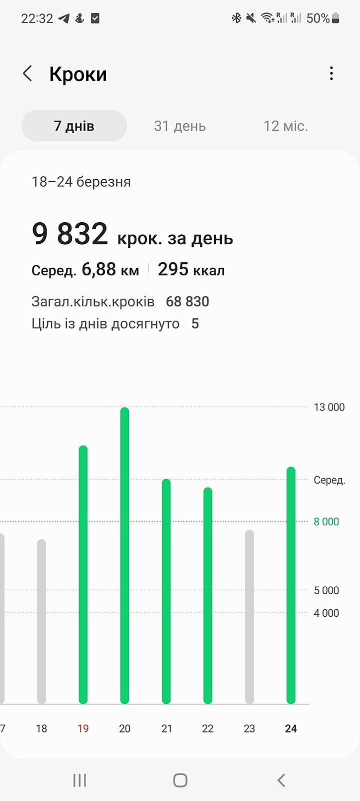 Намагаюсь хоча б 5 тис на день ходити. Живу близько від роботи, тож змушую себе пройтись в якійся ’дальній’ магазин.