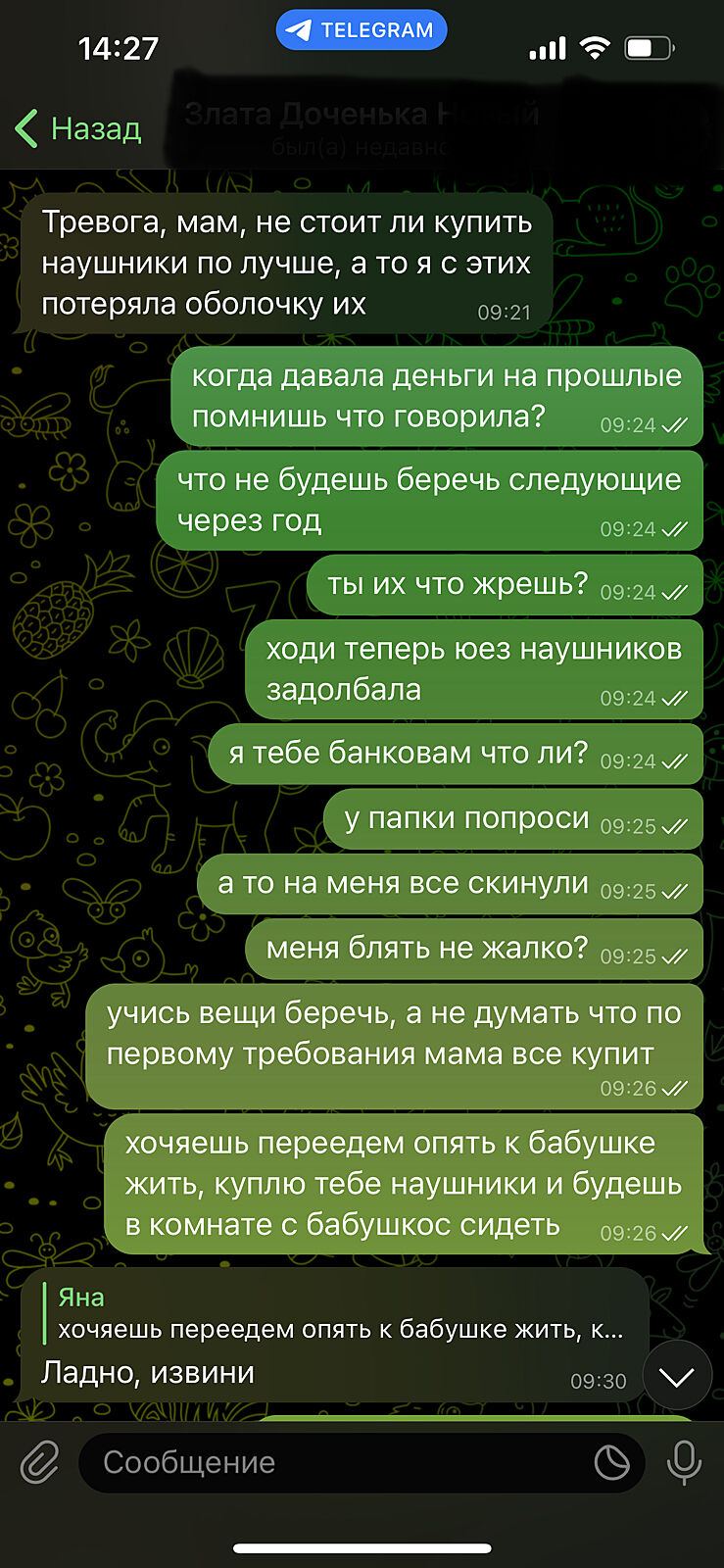 Дочери 14, я в свой адрес только обвинения, споры и требования слышу. Дай денег,купи,ты должна,приготовь нормальное,надо было замуж за нормального выходить,мне нужна отдельная комната, думай как заработать.