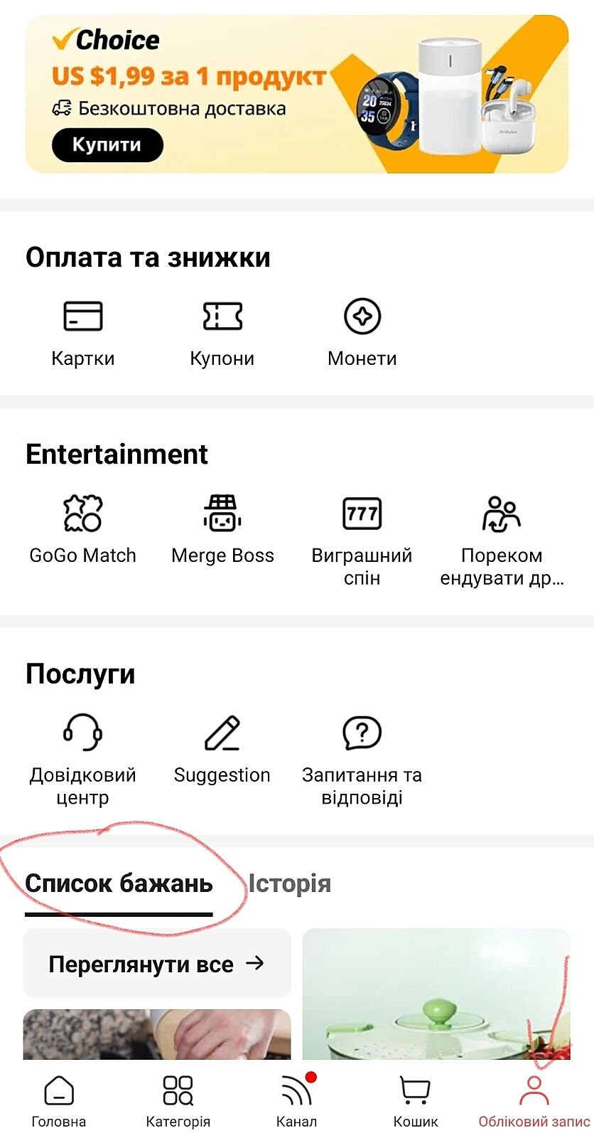 Заходите в пункт Обліковий запис і прокручуєте вниз - Список бажань