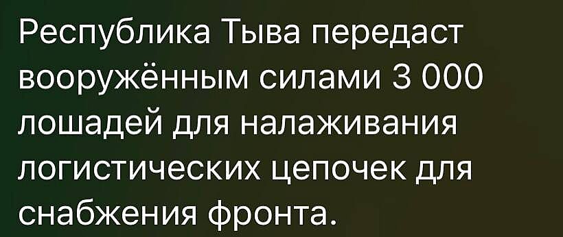 Об этом заявил глава республики единоросс Владислав Ховалыг. Сукаааа, Будённого на них нет! ... @zonov_sl. Ослов уже передали, теперь ослам лошадей нехватает. Show additional replies, including those that may contain offensive content.Республика Тыва передаст вооружённым силам РФ 3 000 лошадей для налаживания логистических цепочек для снабжения фронта.