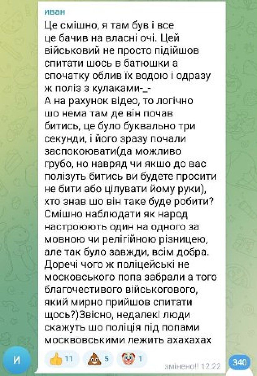 Чоловік, який сьогодні зірвав службу в Хмельницькому, а його самого побили неадекватні попи - військовослужбовець, який своїм здоров’ям заплатив за нашу з вами безпеку. Так, у нього контузія.