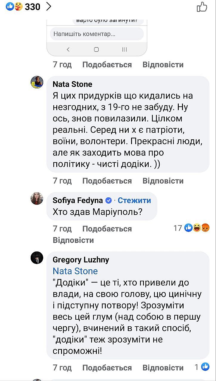 Ті, хто наїхали на пташку, масі, постили тупі картинки про Маріуполь це не секта, а просто відбиті вирод.и. Сподіваюся, що саме завдяки таким петьман себе остаточно політично поховає
