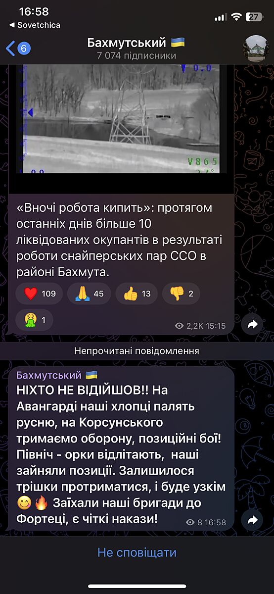 своя рубашка ближче до тіла, кожен труситься за себе. Ті, хто в містах поруч, хочуть, щоб втримали Бахмут любою ціною, щоб не розгатили їх хати. Ті, в кого там чоловіки - хочуть, щоб відійшли на більш безпечні позиції. Свого часу так Маріуполь тримали, щоб вони не поперлися вище. Але чи оправдано то було, ми дізнаємося тільки після війни.