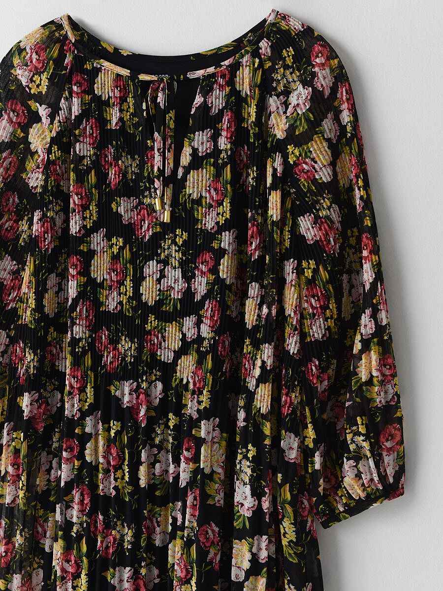 Свободный крой с заниженной линией плеч, длинными широкими рукавами и разрезами по бокам внизу.
