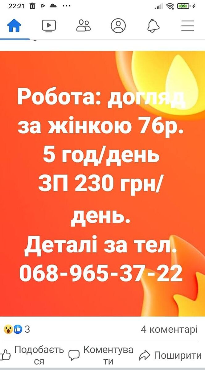 Чого аноніму? Це оголошення з місцевої групи, від реальної людини. Потрапило на очі, хотіла поцікавитись думкою щодо цього питання. Як на мене, це просто смішні гроші, от дійсно. Догляд за літньою особою, навіть якщо вона не лежача, то є пекельно важко. А якщо ця бабця ще й жахливим характером (що в такому віці не рідкість), або ж деменцією...Та що тут казати...мабуть чи не кожний це знає з власного досвіду.