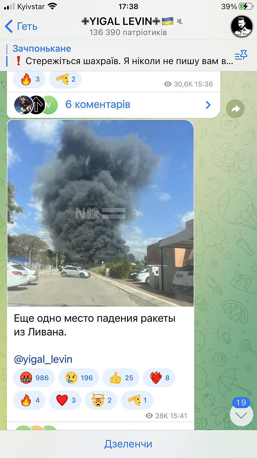 "За последние 2 часа из Ливана по северному Израилю было выпущено 34 ракеты, поставив под угрозу жизнь ни в чем не повинных людей и причинив материальный ущерб. Правительство Израиля примет все необходимые меры для защиты своих граждан от подобных актов насилия".