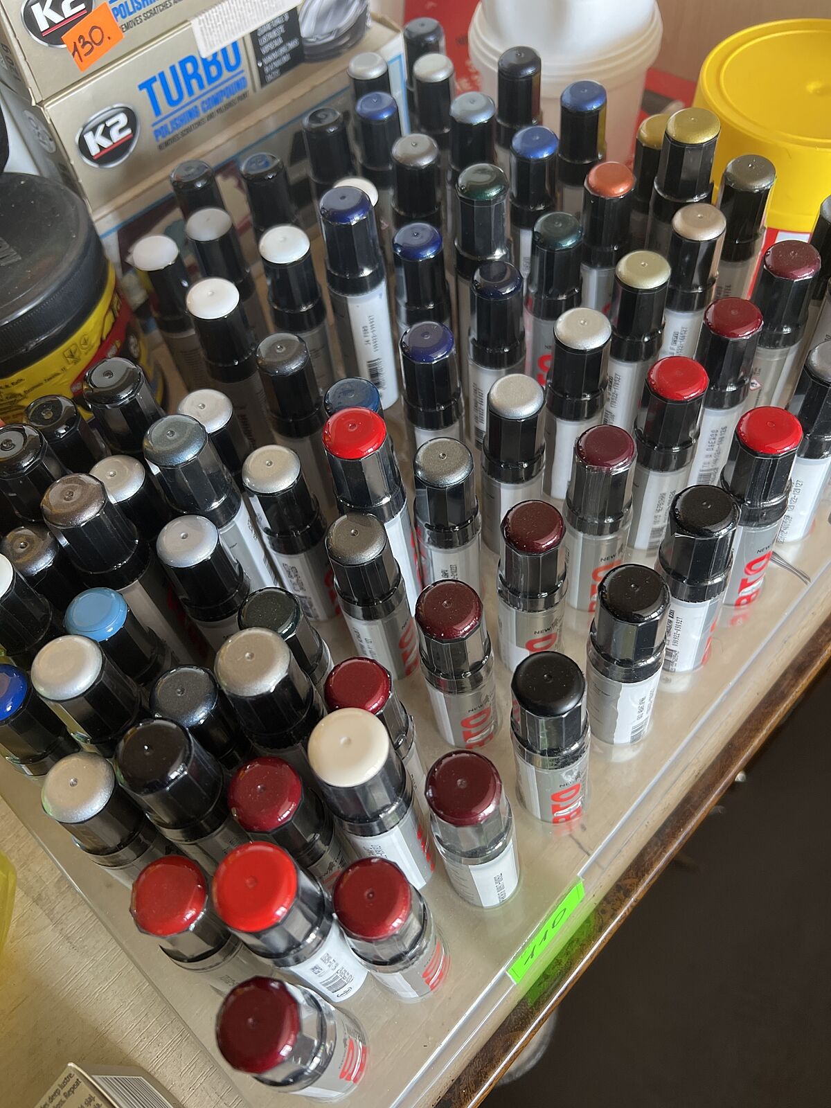 я фарбувала по всім правилам, в мене є доступ до всіх цих матеріалів по роботі. Вам раджу купити гарні якісні акрилові фірби і зробити реставрацію можна покрити лаком для акрилу, якщо купувати в баночках авто фарбу то ви потратите багато коштів і результатом всеодно залишетесь не задоволені, це ж потрібно змішувати потрібний вам колір а в таких олівцях вже готові кольори до авто там чистих пігментів немає.