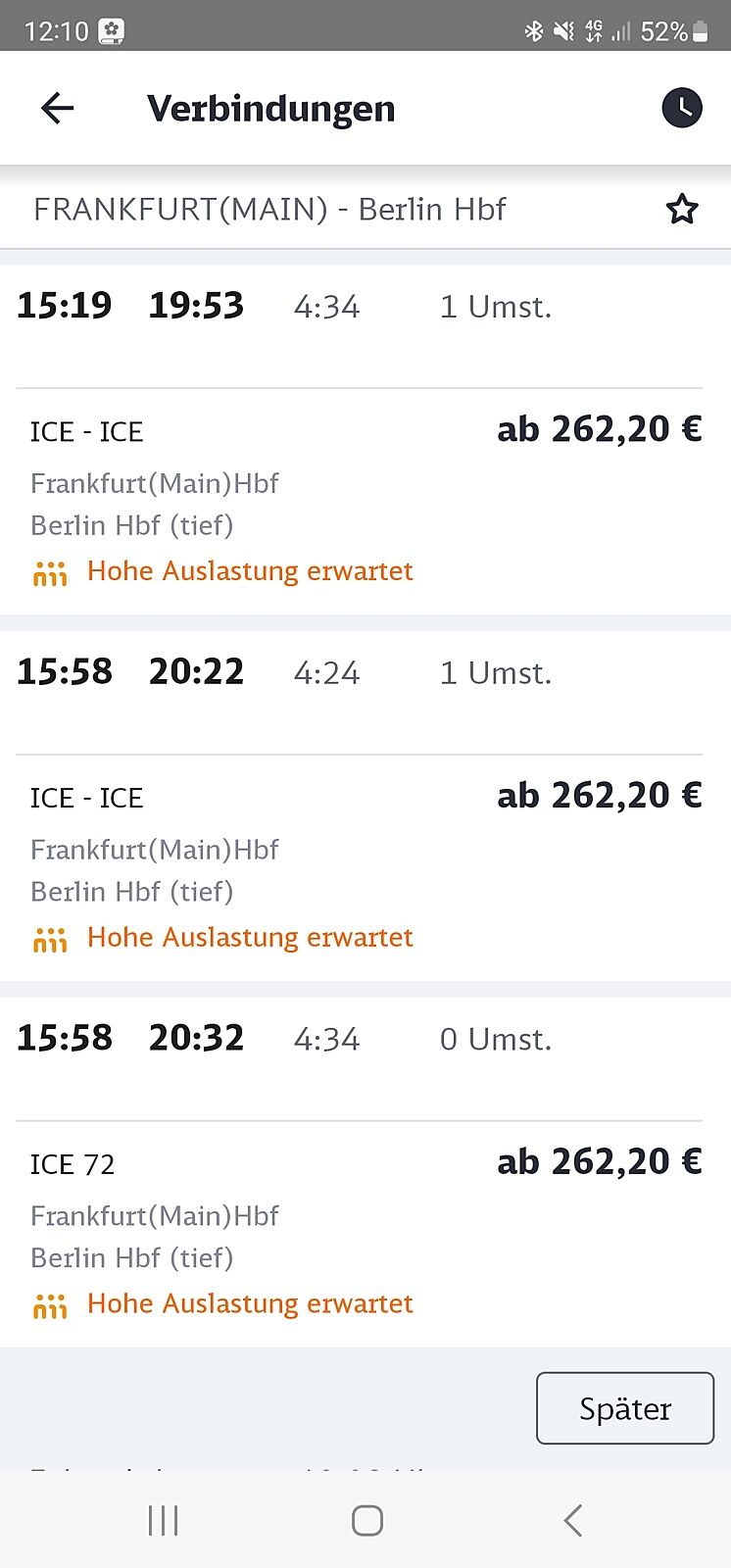 Еще про стоимость проезда в Германии. Быстрые поезда стоят баснословных денег. Вот стоимость поездки на двоих, в одну сторону, из Франкфурта в Берлин. И это при пособиях у людей в 502 евро в месяц.
