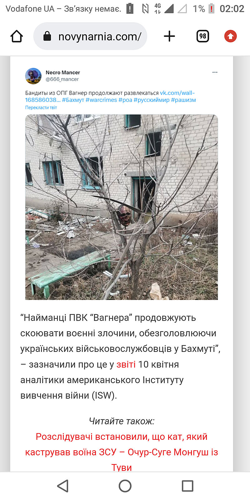 Дівчата, хто є в Твітері, будьласка, репостніть зі згадкою Трампа. Хай побачить і подумає, чи варто пропонувати мир з такими виродками. Я подивилась відео, трусить до цих пір. Це звіряче вбивство полоненого, беззбройного, безпомічного чоловіка і таке неможна пробачати і замовчувати! Я дуже сподіваюсь, що наше СБУ спільно з ГРУ знайдуть тих виродків і кара повинна бути такою ж.