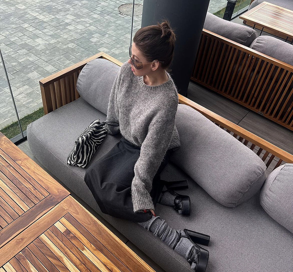 босоножки с носочками носят, иногда это красиво даже в повседневном образе. но тут - шерстяной носок подразумевает, что на улице холодно. а где то тогда верхняя одежда? пусть надевает тогда сверху пальто:) на этот огромный свитер - еще огромное пальто + босоножки на носки - очень стильно, чтоб пройти до тц от машины))