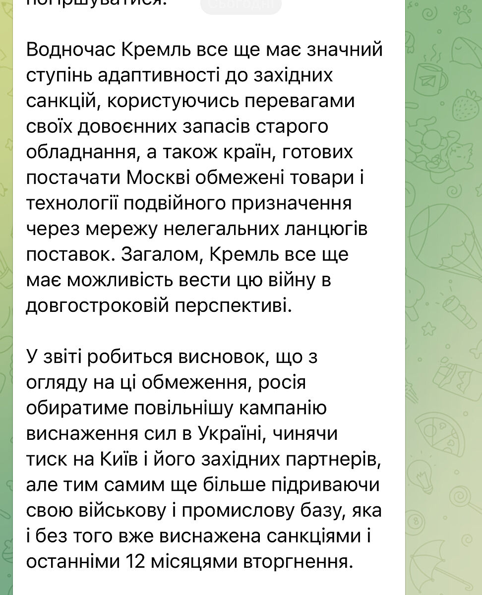 У звіті робиться висновок, що з огляду на ці обмеження, росія обиратиме повільнішу кампанію виснаження сил в Україні, чинячи тиск на Київ і його західних партнерів, але тим самим ще більше підриваючи свою військову і промислову базу, яка і без того вже виснажена санкціями і останніми 12 місяцями вторгнення.