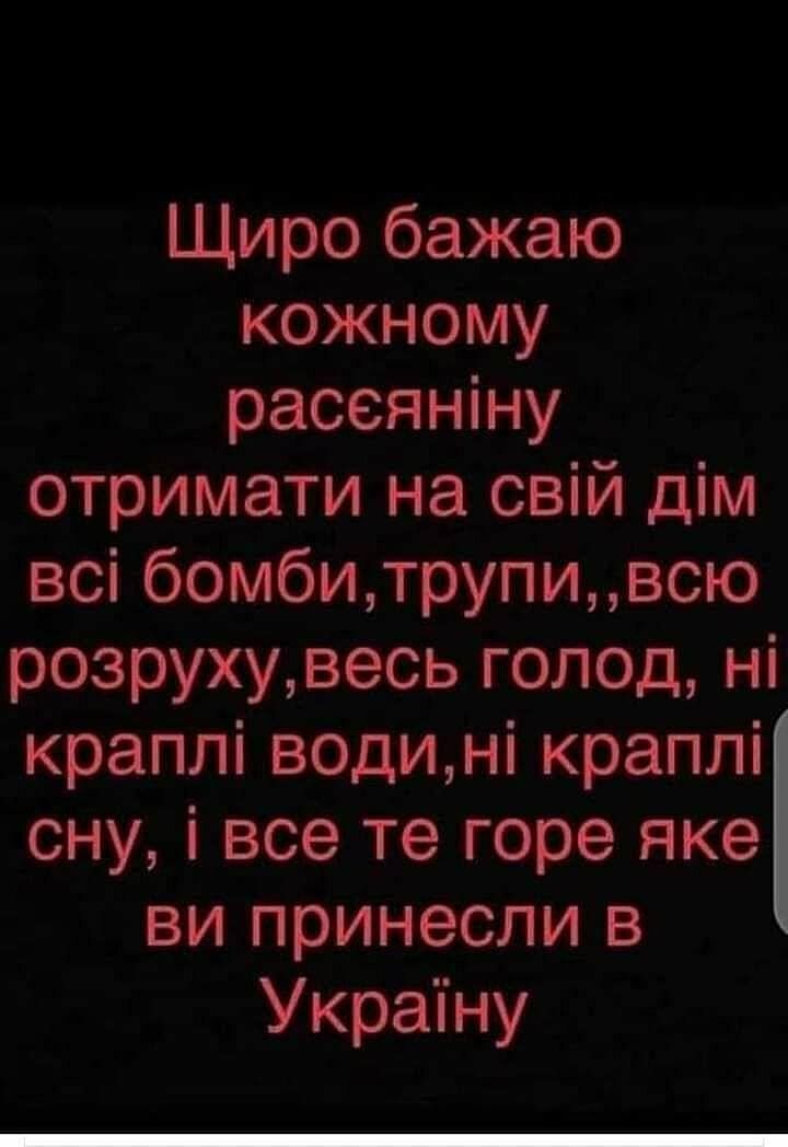 Що знайомого якось вийшов на звязок мацкви (наш знайомий цього мацкві(за вважав адекватним ), з ним вони товаришували, гостювали, отже якщо в перші дні війни мацквіч ще вибачився, то в цей раз сказав, що так як ти нацик, коли погонять на війну, я тебе не вб´ю, збережу тобі життя, в полон візьму, ви працьовиті люди, працюватимеш на благо рашки.