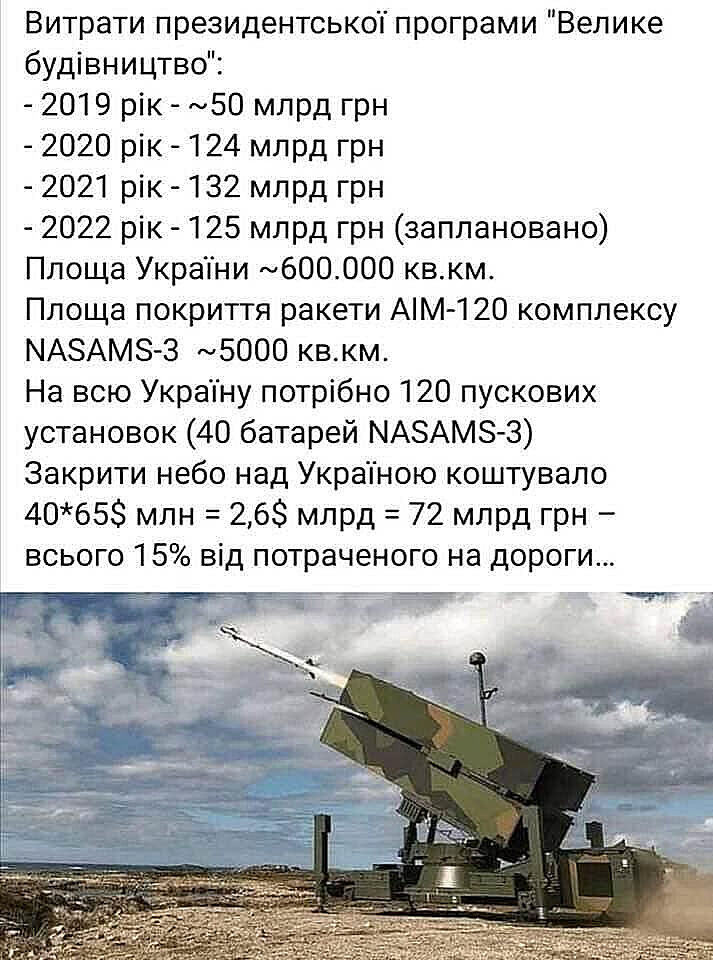 Если бы дороги не строили, то все-равно это бы только немного улучшило ситуацию, сравните расходы на войну и стройку. Оружие вообще стоит сумасшедших средств. Все годы независимости нужно было к этому готовиться по хорошему, тогда бы в 2014 все и закончилось.
