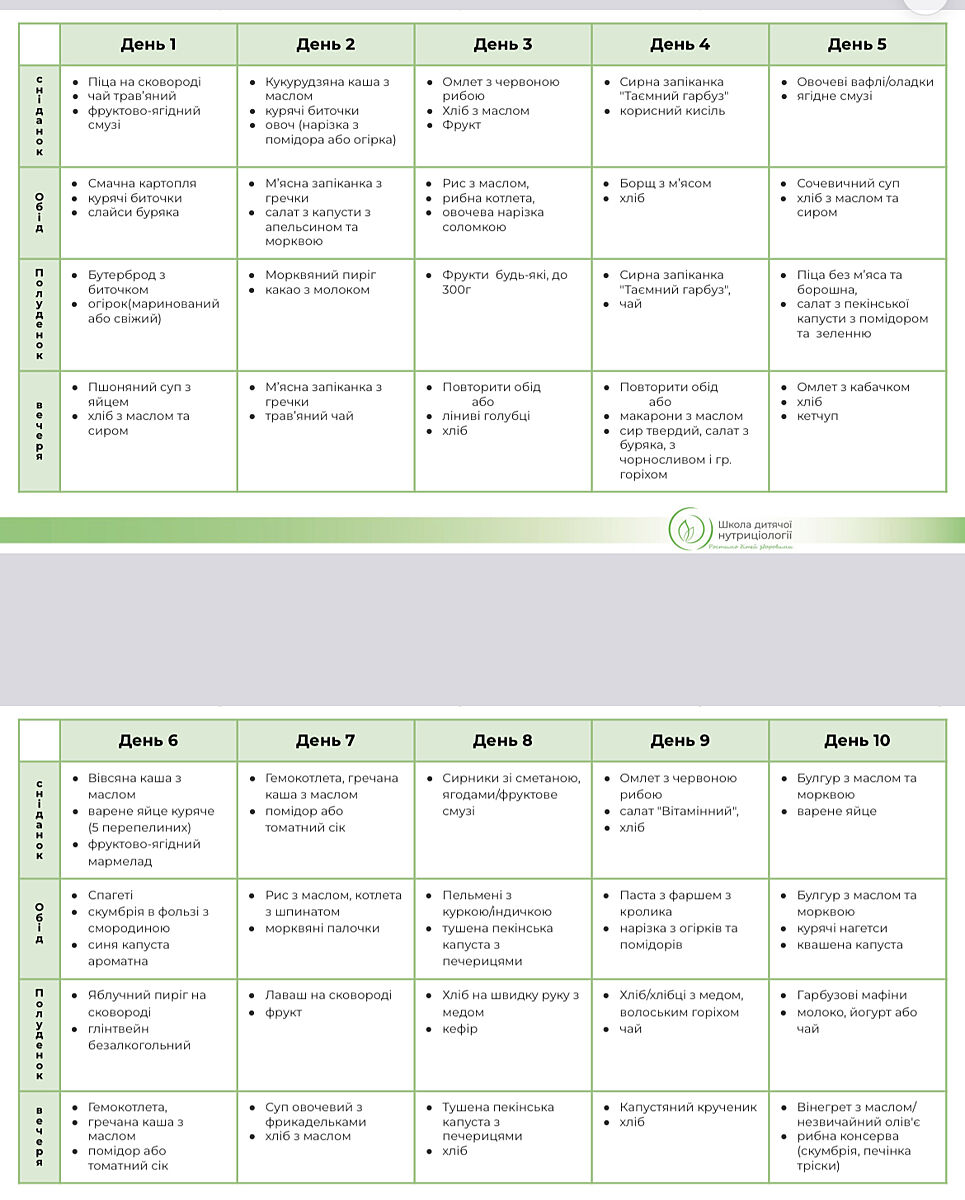 Приблизно меню на 2- 3 дні : творожна запіканка, пшенична каша, сочевиця, телятина з овочами, печені яблука/ груші, печінкові оладки, запечені гомілки.