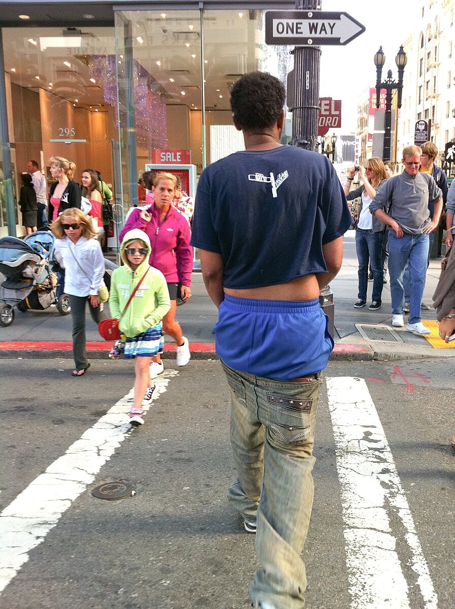 Нет ну ладно сзади, если съехали и трусы не парашуты, а это как памперс выглядит и явно же специально сами вытащили.