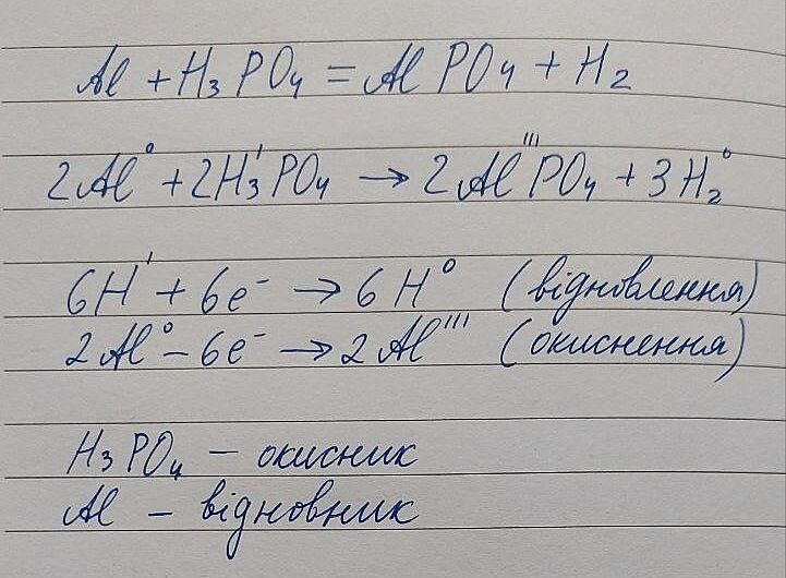 Завдання: Складіть рівняння реакції між алюмінієм і розчином ортофосфатної кислоти. Для реакції складіть схему електронного балансу. Вкажіть окисник і відновник, процеси окиснення і відновлення.