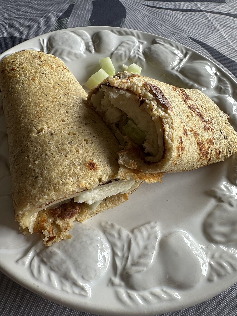 2 ложки столовые хлопьев , молоко грамм 100 яйцо плюс чуток соли и травы. В блендере взбить и на разогретой сковороде с чутком масла обжарить , внутри что угодно)