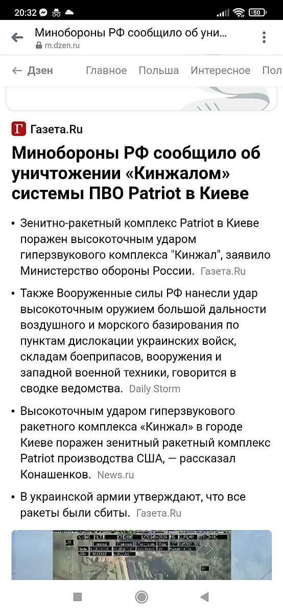 ЗРК Patriot в Киеве, видимо, поврежден, но не уничтожен, пишет CNN. Минобороны РФ ранее утверждало, что комплекс Patriot в Киеве был уничтожен ’высокоточным ударом’ ’Кинжала’. ВСУ в свою очередь сообщили, что украинская ПВО сбила все 18 ракет, выпущенных в ночь на 16 мая по Киеву, в том числе шесть ’Кинжалов’.