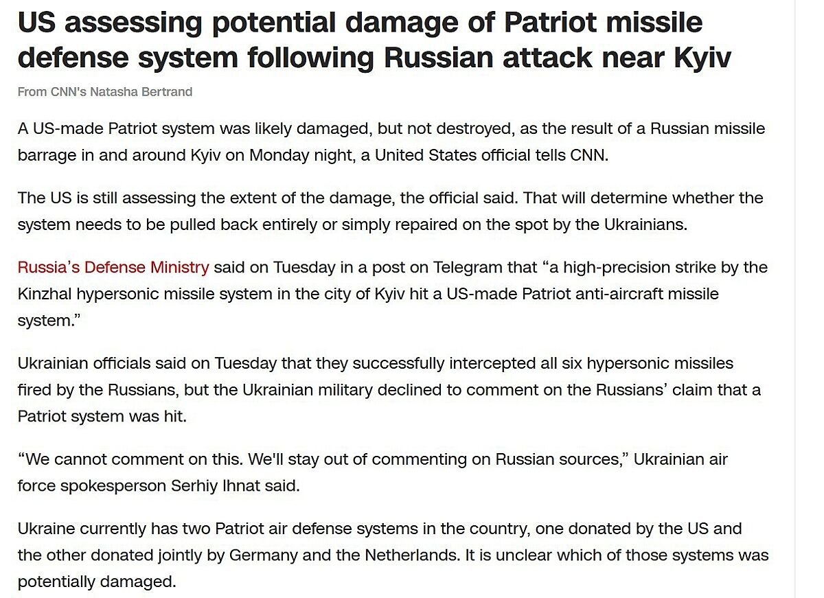 CNN з посиланням на офіційного представника США заявили, що ЗРК Patriot, встановлена поблизу Києва, ймовірно, була пошкоджена, але не знищена внаслідок ракетного обстрілу