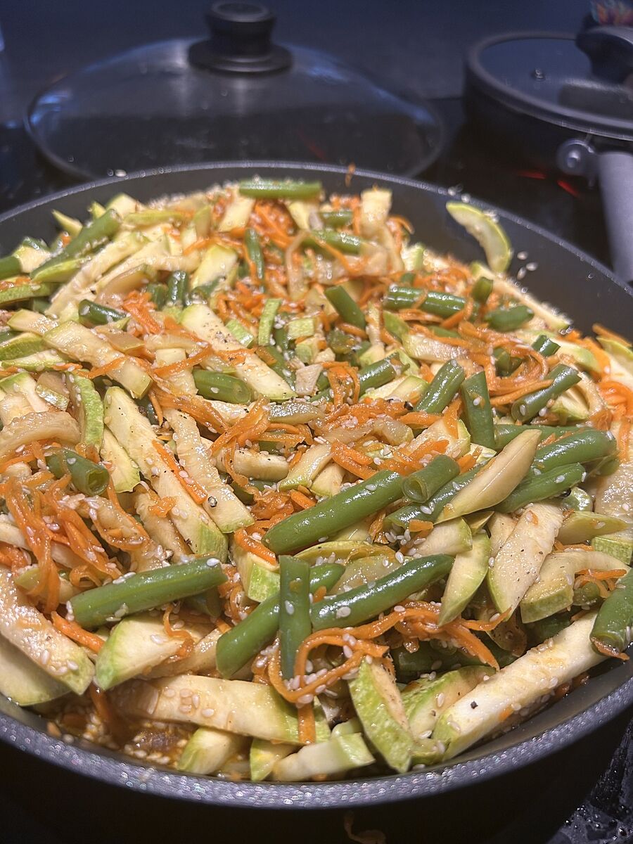 Овочеве рагу. Додати цибулю, моркву, цукіні, капусту протушкувати чи обсмажити трохи. Смачно. Якщо є притрусити часником та петрушкою як буде готово