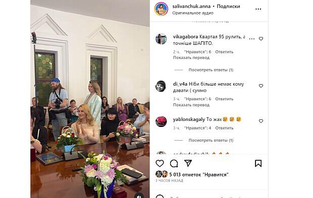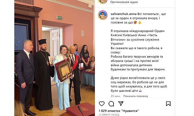 Кроме того, в своих сторис Саливанчук разместила официальный документ, указывающий, за что конкретно она была награждена. В нем прописано: ’за ежедневную высокопрофессиональную кропотливую работу, поддержку экономики страны, оказание благотворительной помощи в это трудное для страны время, высокое национальное достоинство и добросовестное служение на благо народа Украины’.