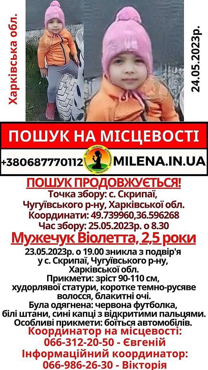 Приметы Виолетты Мужечук: рост 90-110 см, худощавого сложения, темные волосы, голубые глаза. Была одета в: красную кофту и белые брюки. С вечера к поискам девочки приступили полиция, кинологи, ГСЧС. Подключился поисковый отряд "Милена", на местности работали десятки добровольцев с квадрокоптером и тепловизионным оборудованием. Однако на утро 24 мая малышку пока не нашли. Правоохранители просят всех, кто знает любую информацию о ребенке, сообщить в отдел полиции №2 Чугуевского районного управления ГУНП по телефонам: 102, +380503055233 или другим удобным способом.