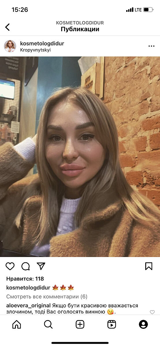 мне одна попалась в инсте такая,на нее глянешь ходяч. антиреклама,но с другой стороны,это ж ей коллега делала ,а не сама,посмотрите косметолог дидур,там полный мрак,губища,бровища,скулы ,вот вот треснет лицо