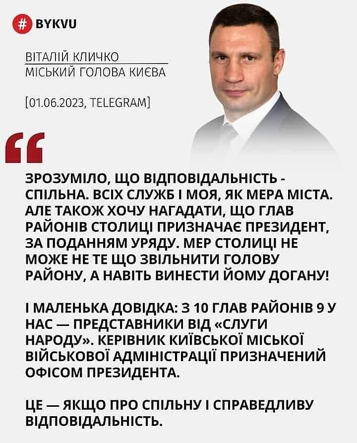 Проте. Відповідальною за сховища є Військова адміністрація Києва на чолі з генералом Попко. Ще 24 травня він відрапортував що всі укриття в століці будуть відчинені. Не були. На місці, за сховища відповідала адміністрація Деснянсткого району, яку очолює Дмитро Ратніков - представник ’Слуги народу’, на секундочку.Хтось згадав про цих осіб? Ні, всі камені зразу ж полетіли в Кличка. Чому? Бо, секрет Полішинеля, команда ЗЕ від дня президентсьеих виборів силиться опанувати владу у Києві. Бо сидячи в Києві, реально, столицю зелені не контролюють. В Києві більшість - це партія Кличка і ЄвроСолідарність Петра Порошенка.