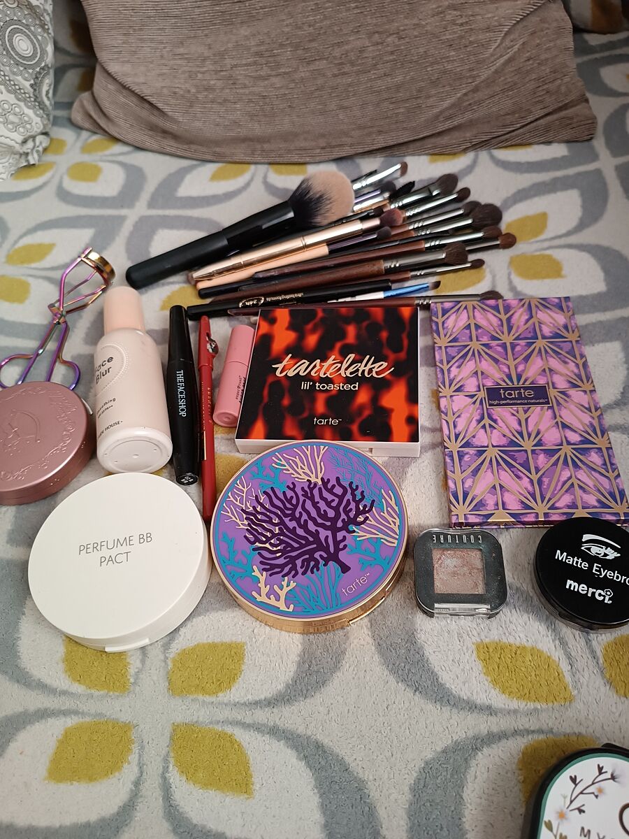 Тушь воск-тени для бровей тоналка пудра румяна и помада,ну карандаш ещё есть коричнево серый и белый.меньше 10 шт,маленькая косметичка