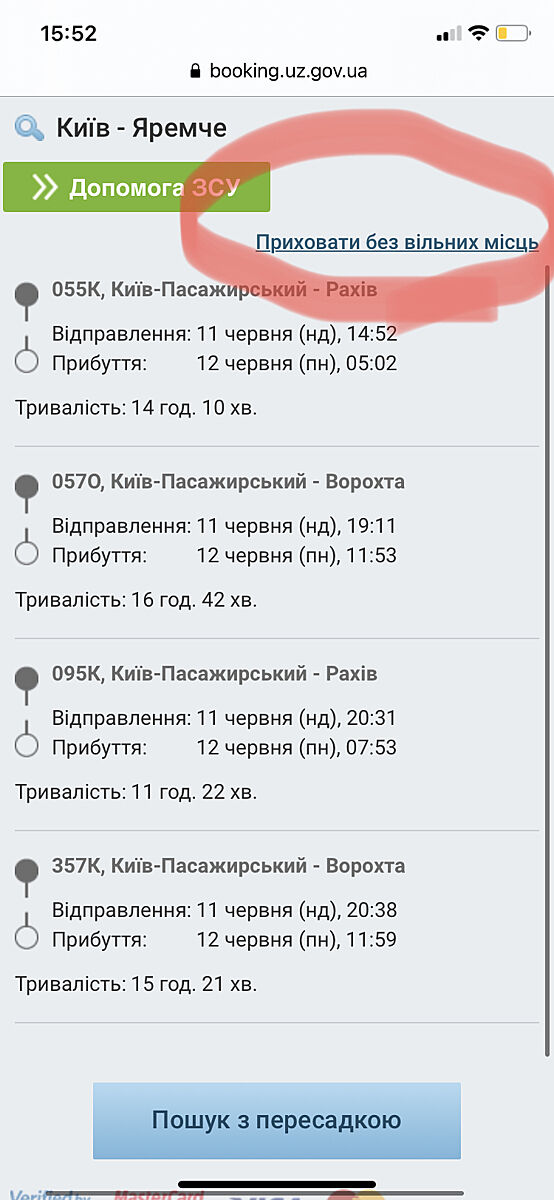 357 Київ Ворохта з 10/06/2023 щоденно * курсує зі змінами 11-15, 18-22/06/2023 Київ-Пас. 20:38 Яремче 11:56 12:00