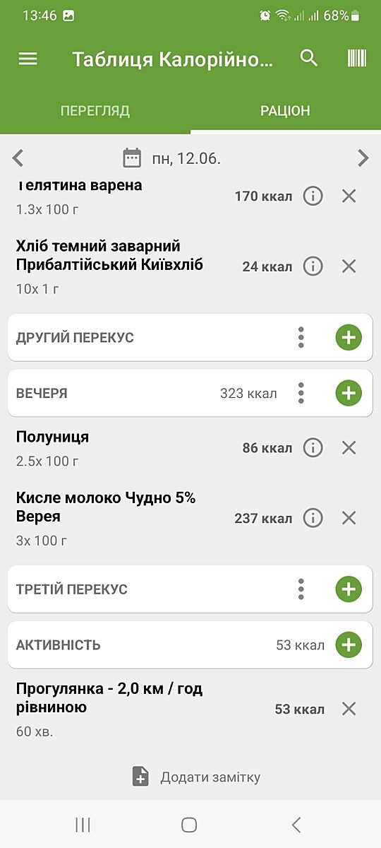 Якось не йде схуднення, хоча виключила майже вуглеводи. Сьогодні вирішила забити в програмку першу-ліпшу, що зїла за день. От що вийшло. Не розумію чому так мало ккал, може воно неправильно рахує. І не розумію чим додавати волокна і вуглеводи. Жирів багато, побачила. Люблю домашній сир і кисляк, а вони жирні/зараза. Інший мені не смачний. Іноді зранку 2 яйця, побачила ще більше жиру буде. Сир такий купую через тиждень або два, тобто не постійно. Часто 100 гречки і овочі або просто гречка 150г. Замінила в грограмі, але вона погоди не робить. Вечеря може бути риба хек смажена і салат з капусти або яйце якщо зранку була гречка-замість полуниці і кисляка.