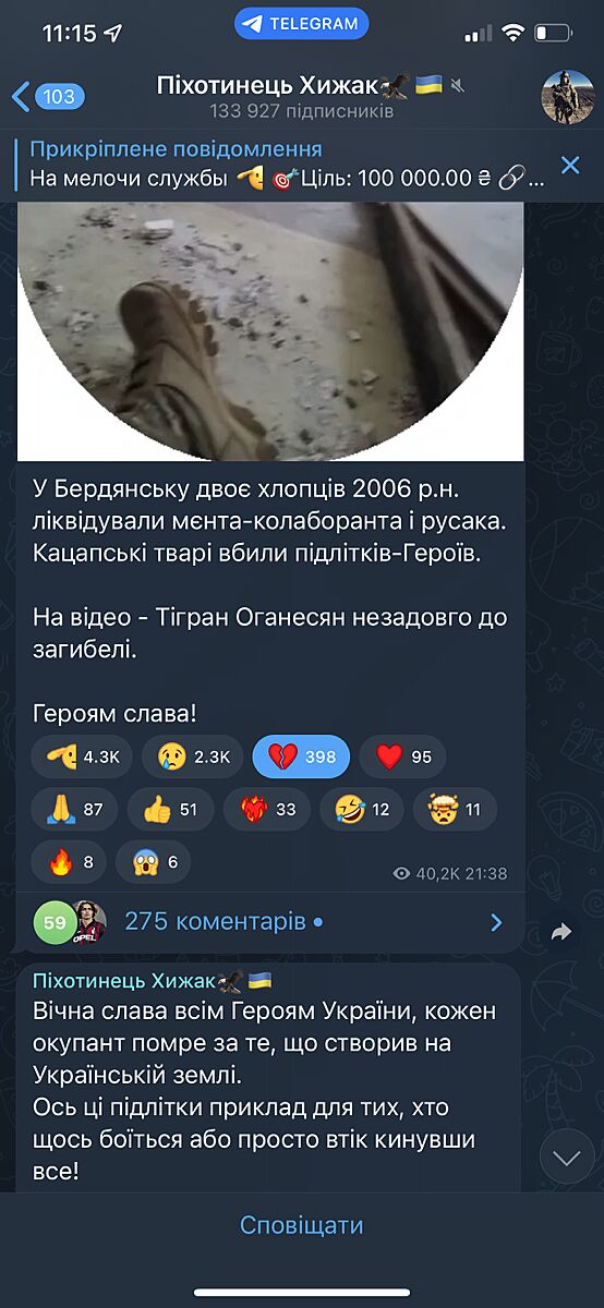 Мова про мужніх підлітків , що не боялися чинити опір окупантам . Пишуть, що Тигран постійно розказував історію України, за що окупанти спалили всі книжки що були в будинку . А після вбивства двох орків хлопців теж ліквідували . Не всі дорослі мають стільки мудрості та відваги …шкода дітей .