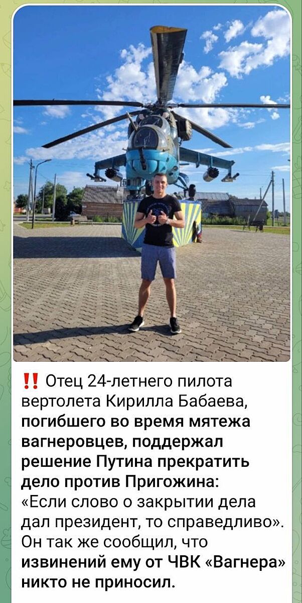 Фото 3: пилот Бабаев, отец которого поддержал решение Путина прекратить дело против Пригожина: «Если слово о закрытии дела дал президент, то справедливо». Эталонный раб. Потому что сына можно и нового сделать, а путин у страны один.