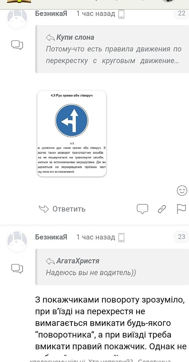 При в´їзді на перехрестя з круговим рухом- покажчики поворотів не вмикаються, при виїзді- вмикається правий покажчик повороту. А те,що правил не знаєте і людей при цьому називаєте ’ чарівними’. То що я можу сказать? Тільки воздать хвалу небесам, що їздимо ми з вами різними дорогами.