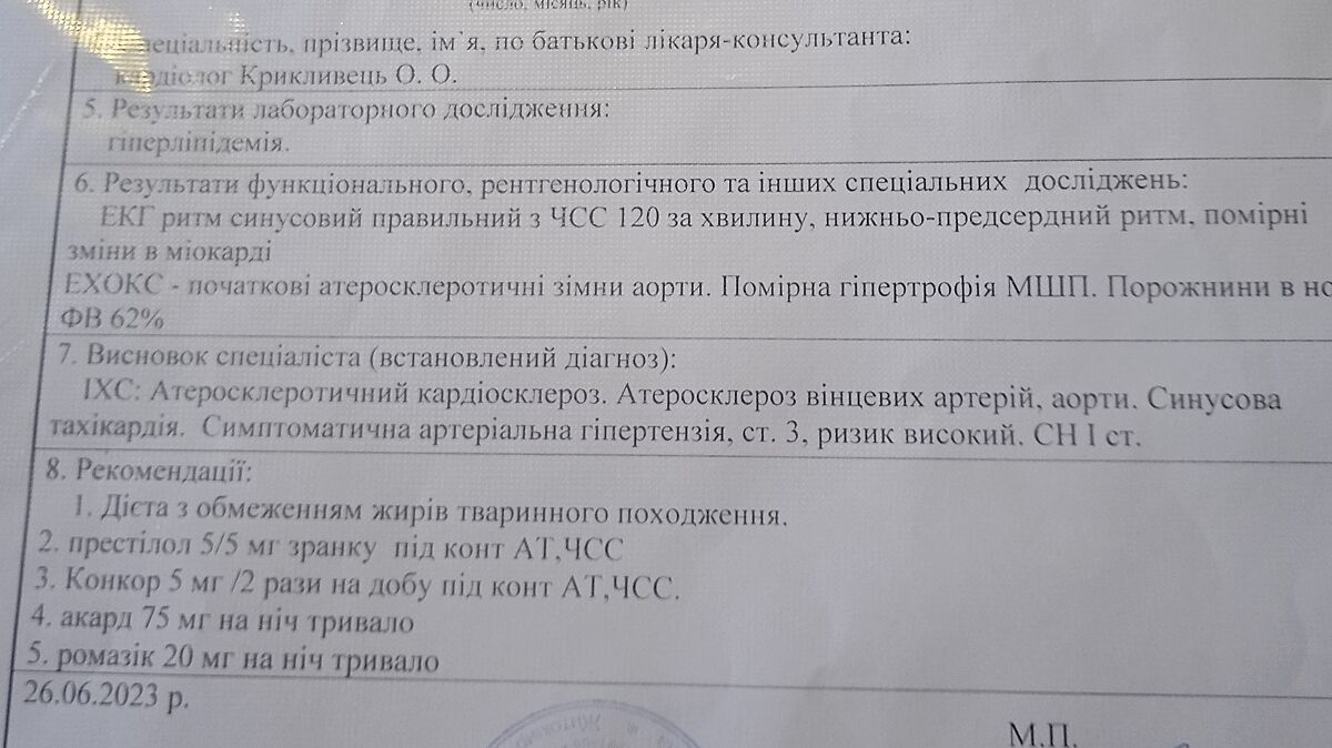 Ішемічна хвроба серця. Атеросклероз. Гіпертонія 3 ст. високий ризик, симптоматична, тобто вторинна (є симптомом іншого захворювання). Серцева недостатність 1 ст.