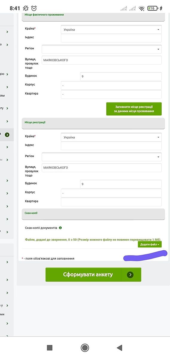 При заполнении анкеты я допускала ошибки, они писали ответ-видмовлено и писали причину. Потом я опять заполняла анкету, данные с паспорта, прописка, адрес, рнокпп. Могут отказать, если сканы чернобелые или малейшая ошибка а своих данных. Я всё никак не могла правильно внести номер дома, он через дробь. Оказывается надо вносить, как записано в паспорте-101/2 номер дома. Я эту двойкуписала в ячейку корпус. Вобщем,с горем пополам сделала. Приняли.
