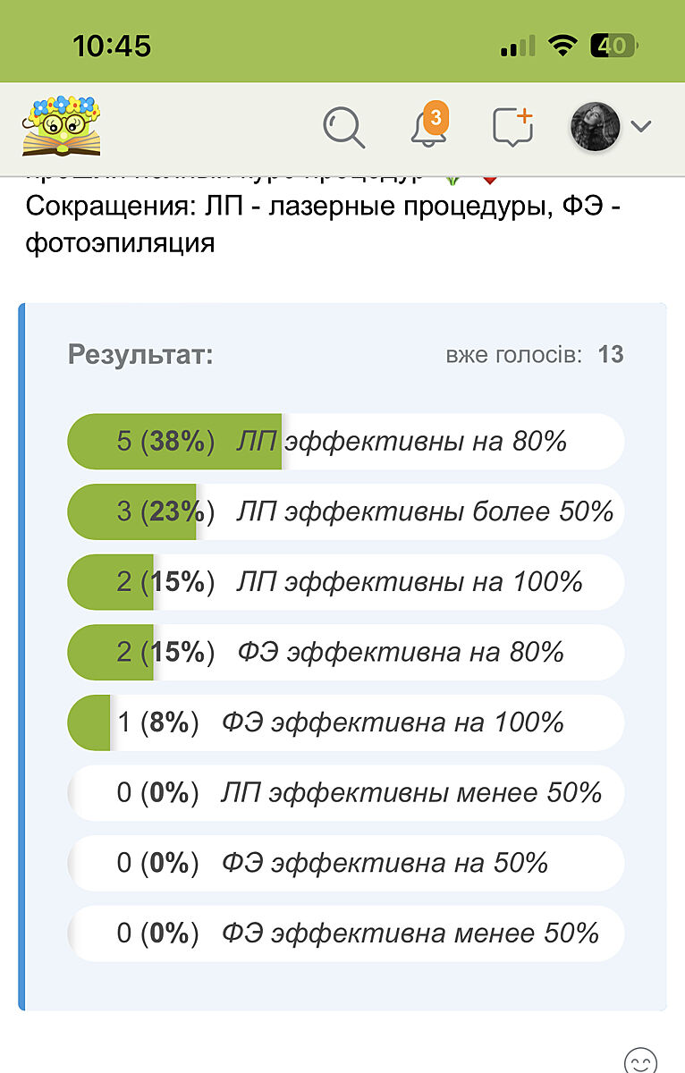 Роблю лазер 3 роки. На ногах та під пахвами все гладке. А от в зоні глибокого бікіні є трохи волосся на губах, але воно стало світле та м’яке. Легко збриваю раз у 5-7 днів, подразнення немає. Тому проголосувала за 80%.