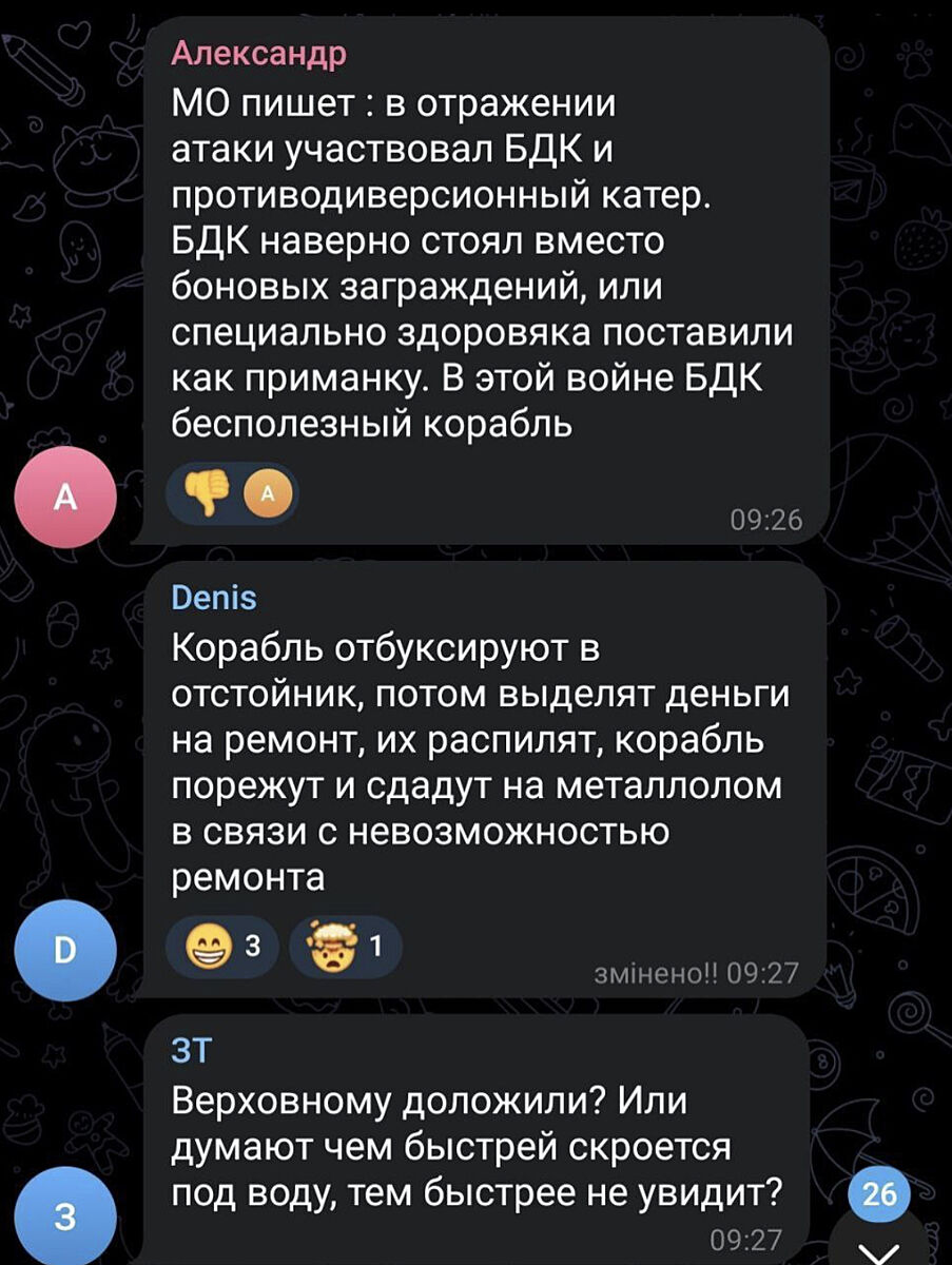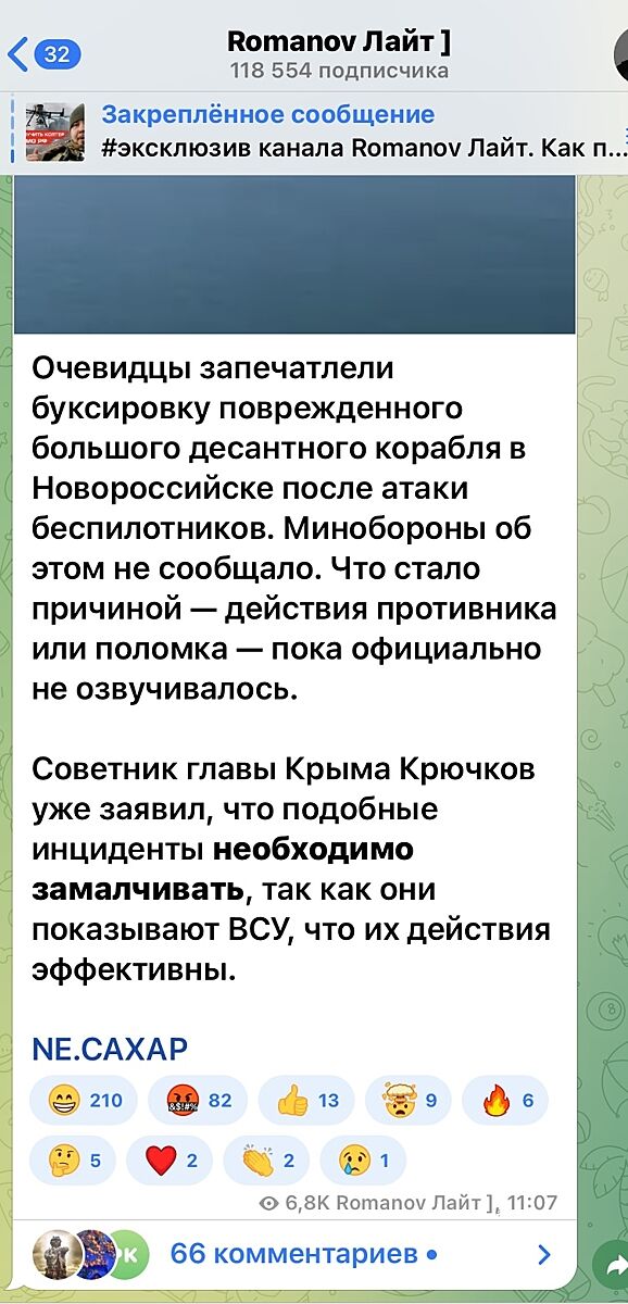 Ах да, і Чорноморський флот РФ дуже успішно відбив останню українську атаку дронами Magura V5 на порт Нороросійськ. Ось чому десантний судно ’Оленогорський Горняк’ тепер виглядає як на прикріплених відео-шторах. -