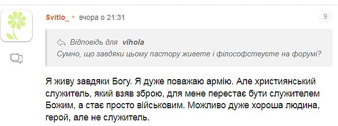 То він 20 років обманював своїх прихожан коли говорив не вбий. Він же не говорив - ну захищатись можна.