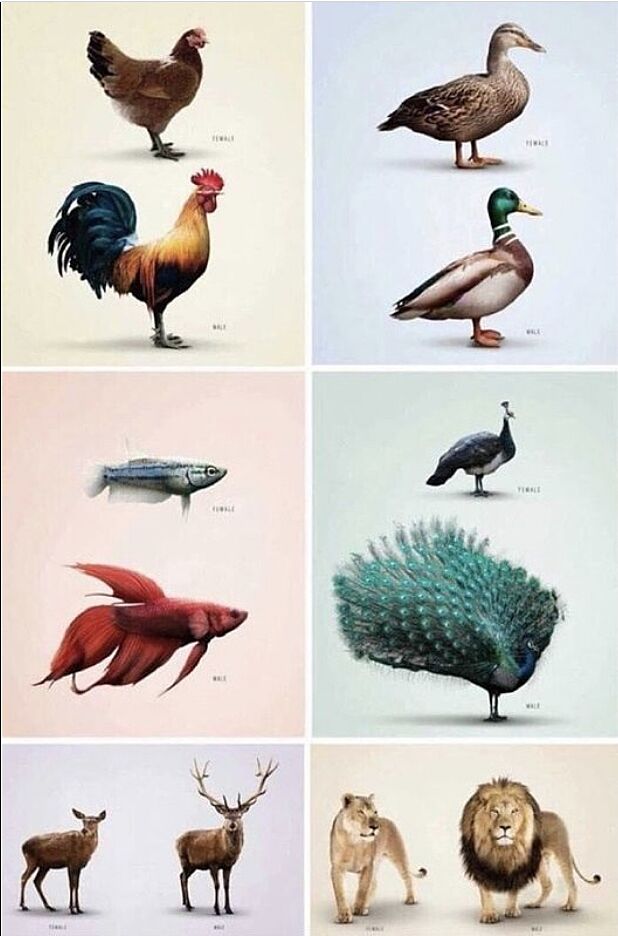 У світі людей взагалі все пішло в якомусь неправильному для тваринного світу напрямку. Серед тварин, птахів, риб, комах самочки зазвичай сірі та непримітні, а от самці яскраві і саме самці мають старатися, щоб отримати увагу від самочки. Самці танцюють шлюбні танці, самці відвоювують самок у інших самців. А у людей навпаки - жінки зі шкіри лізуть, щоб отримати увагу чоловіків. Треба повертати правильну ієрархую, геть бритви!