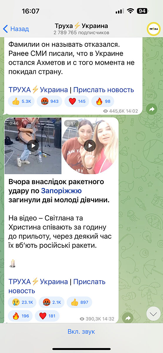 Вчора прилетіла ракета, 3 загиблих, з них 2 молодих дівчини 18 і 21 року. Вони співали біля того міста, де був прильот, збирали на ЗСУ. Дві молоді талановиті і красиві дівчини.