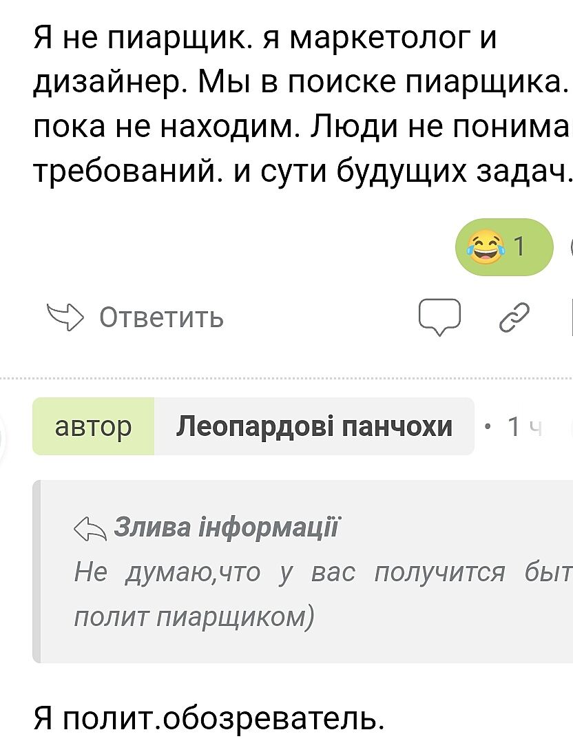 А ще, просто дружня порада, якщо ви не троль… кидайте працювати за 4х - це не норма, для поважаючого себе спеціаліста)) людина не може якісно виконувати обов’язки в 4х галузях.